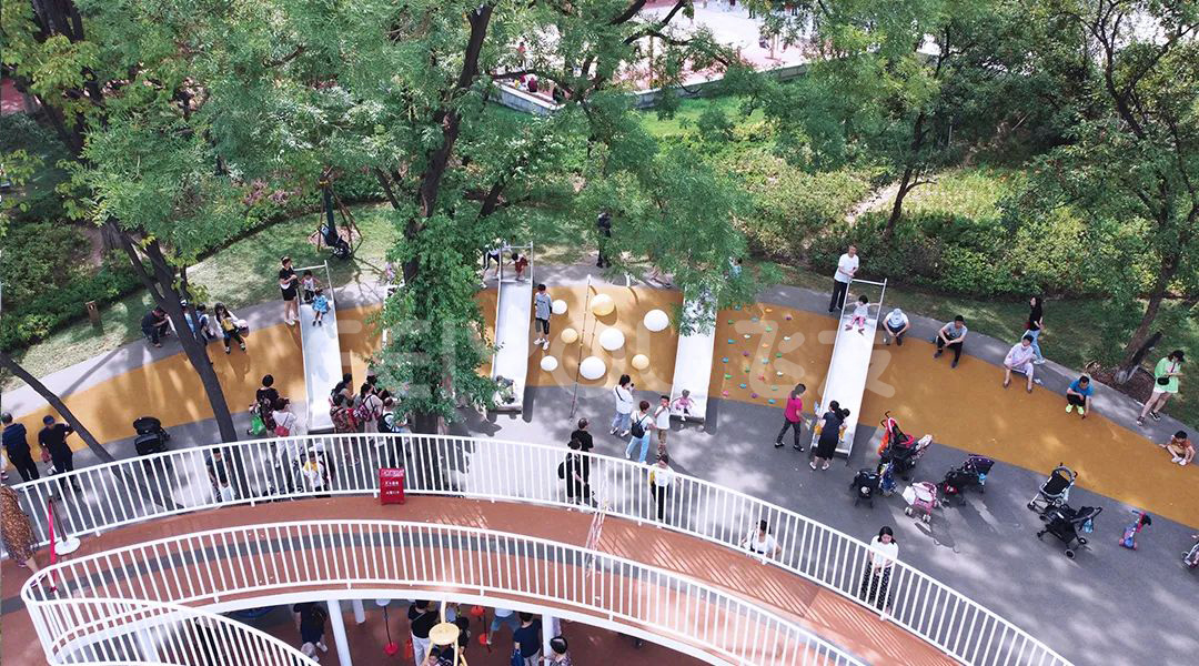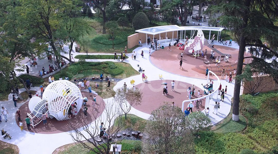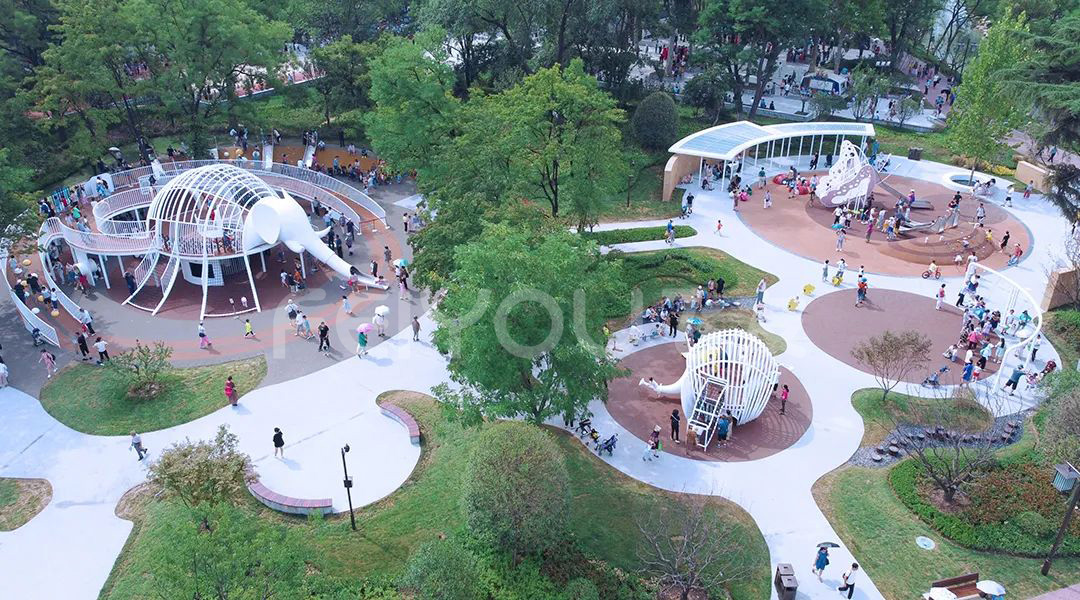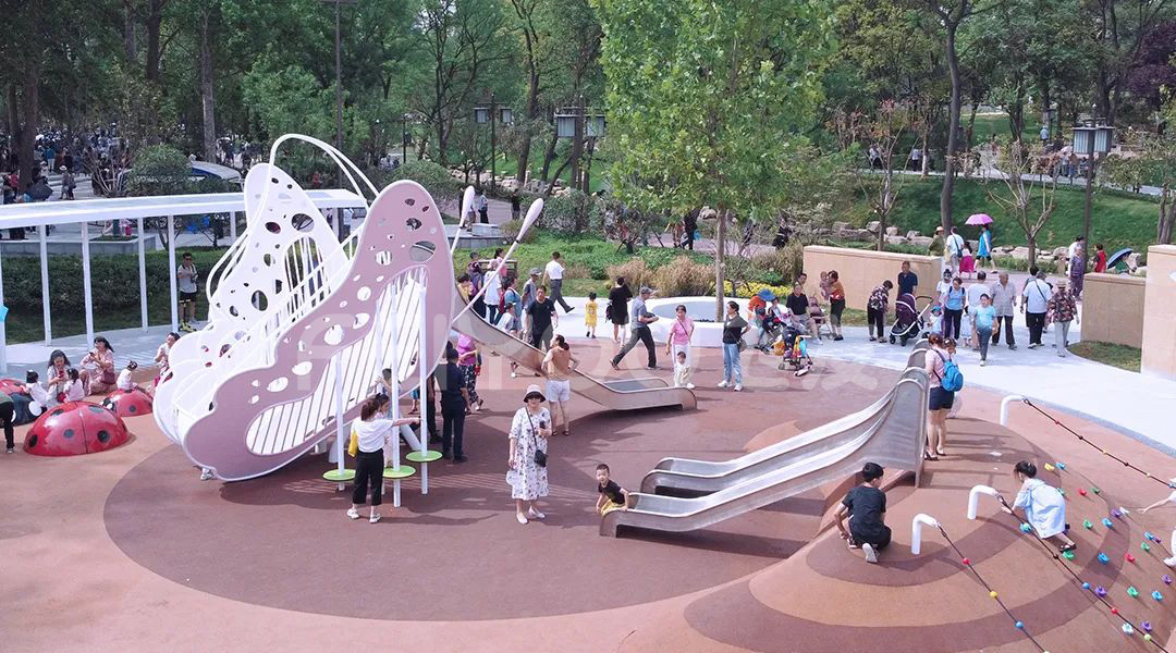 興慶宮兒童場(chǎng)地根據(jù)故事線分成了蝴蝶森林、大象山谷、小象滑梯和多功能游樂(lè)區(qū)四塊。