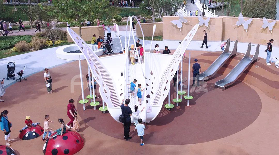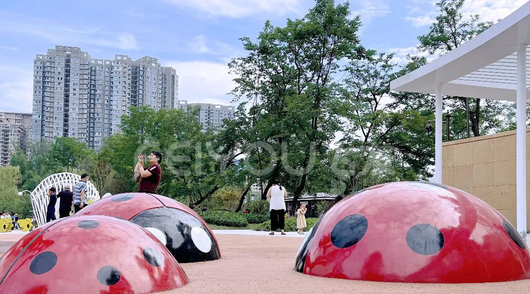 在蝴蝶造型的滑梯旁,還有幾個(gè)小伙伴七星瓢蟲,小朋友們玩累了就可以在上面休息。旁邊的滑梯也可以和小伙伴一起玩哦。