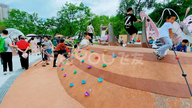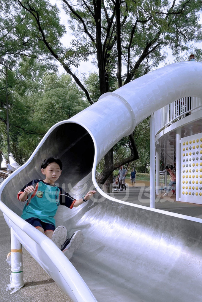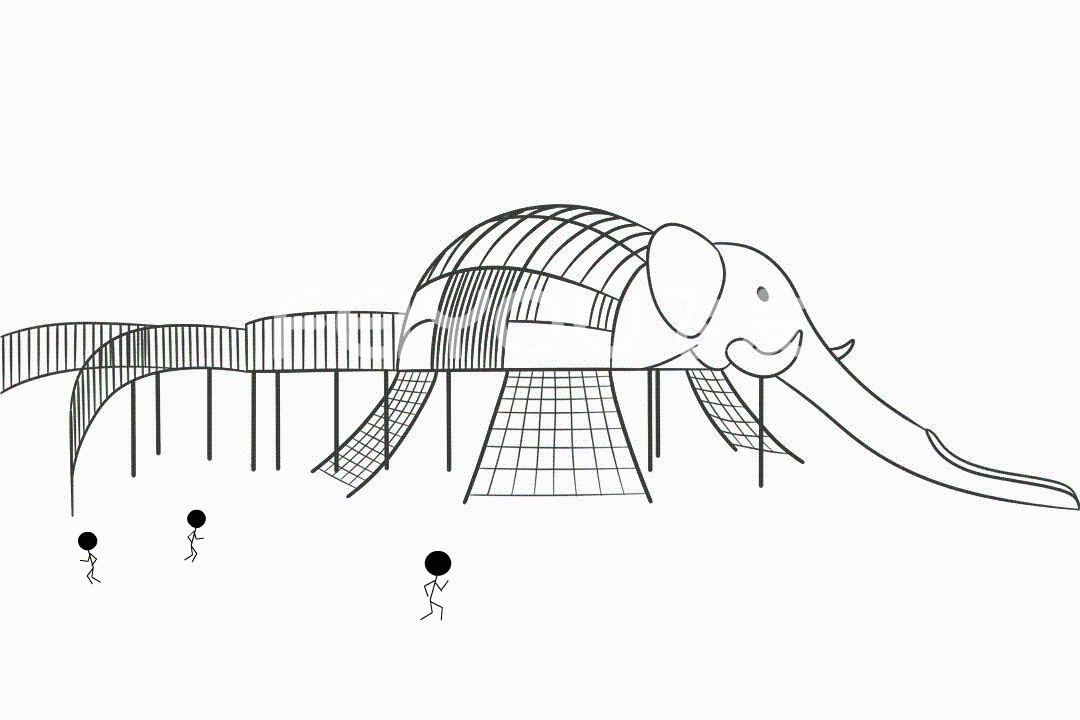 距離它們不遠(yuǎn)處,還有一個(gè)巨型的大象滑梯,目測(cè)最高處近10米,長(zhǎng)長(zhǎng)的鼻子是下滑通道,兩邊設(shè)置“S形”坡道可以走上去,還為膽子大的小朋友設(shè)置了黑色攀爬網(wǎng)。
