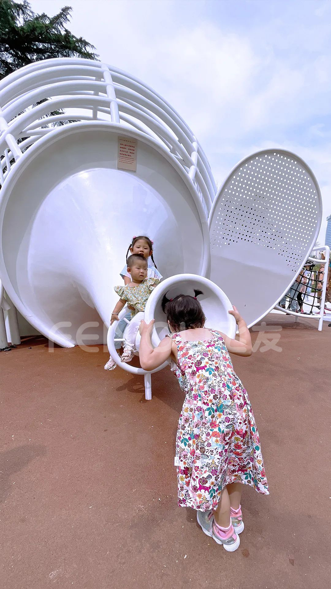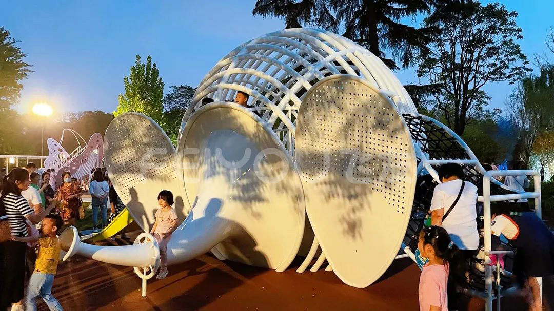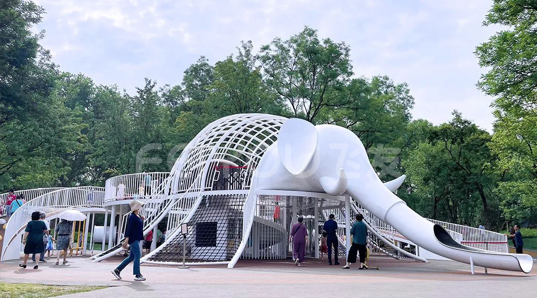 在大象旁邊是一個(gè)白色鋼結(jié)構(gòu)的大象造型的滑梯,通體鏤空造型,一邊“耳朵”設(shè)置了攀爬區(qū)域,另一邊“耳朵”則是一個(gè)黃色的滑梯。