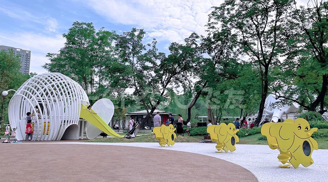除了各種大象造型的滑梯,這片區(qū)域內(nèi)還穿插放置著黃色的彈簧椅,也是大象造型的,小巧的體積看起來(lái)分外可愛(ài)。此外,“象群”周圍的緩坡上,還設(shè)置了幾個(gè)小型滑梯和攀爬點(diǎn)。小朋友們玩滑梯再也不需要排隊(duì)了。