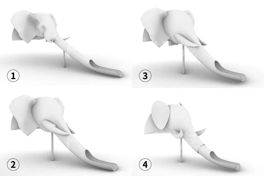 標(biāo)志性的大象滑梯的大象頭在設(shè)計(jì)之初就做了好幾版,從最初的的具象化的到最終卡通可愛(ài)的大象,設(shè)計(jì)師們站在孩子的角度,為做出讓孩子喜歡的設(shè)計(jì)而努力著,這也是我們的初心,讓孩子們?cè)谖覀兊淖髌分锌鞓?lè)成長(zhǎng)。