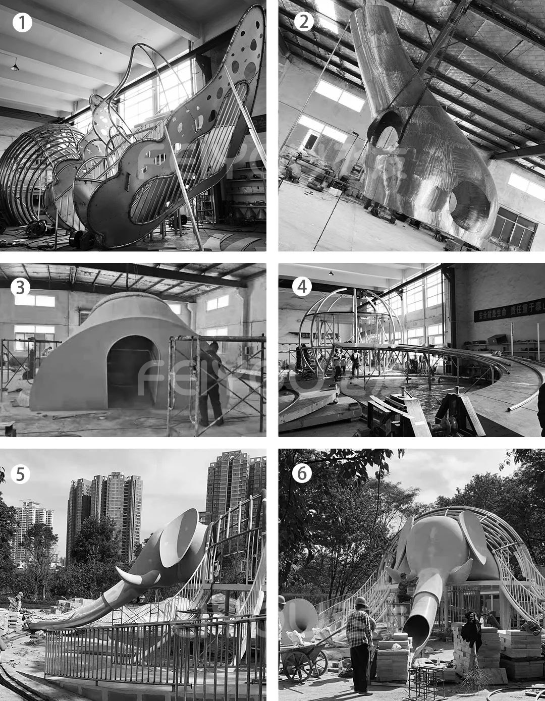 △ ①~ ④工廠生產(chǎn)圖 ⑤~⑥大象滑梯安裝